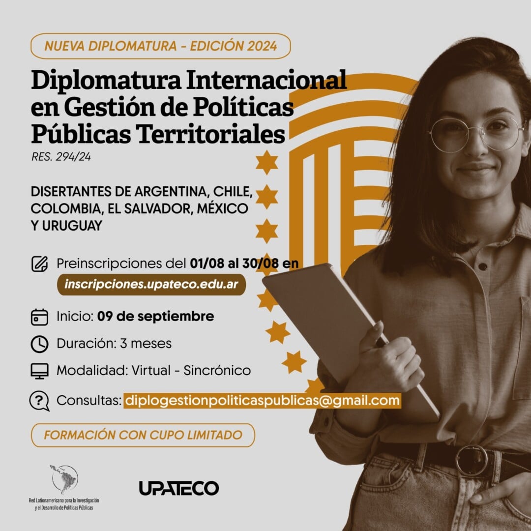 La Diplomatura Internacional en Gestión de Políticas Territoriales es un programa de formación permanente de la Red Latinoamericana para la Investigación y el Desarrollo de Políticas Públicas, de la cual, en la primera edición en el año 2023 egresaron 60 estudiantes de 9 países de América Latina y se la dictó con el aval de la Universidad Estatal de Bolívar de Ecuador.