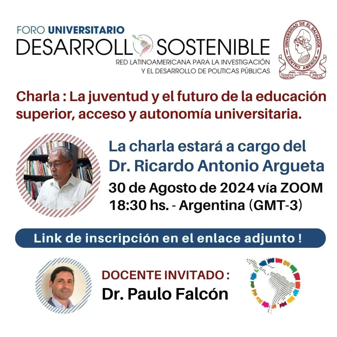El Equipo Coordinador del Foro Universitario para el Desarrollo Sostenible, de la Red Latinoamericana para la Investigación y el Desarrollo de Políticas Públicas, tiene el agrado de invitarlo/a a participar de la charla: La juventud y el futuro de la educación superior, acceso y autonomía universitaria.